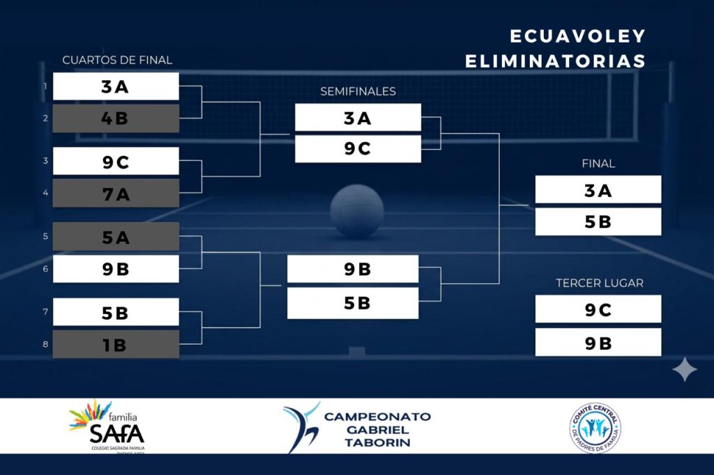 Aquí dejamo la llave final de ecuavóley, donde se puede observar el recorrido que realizaron los equipos desde las fases anteriores hasta llegar a la gran final.